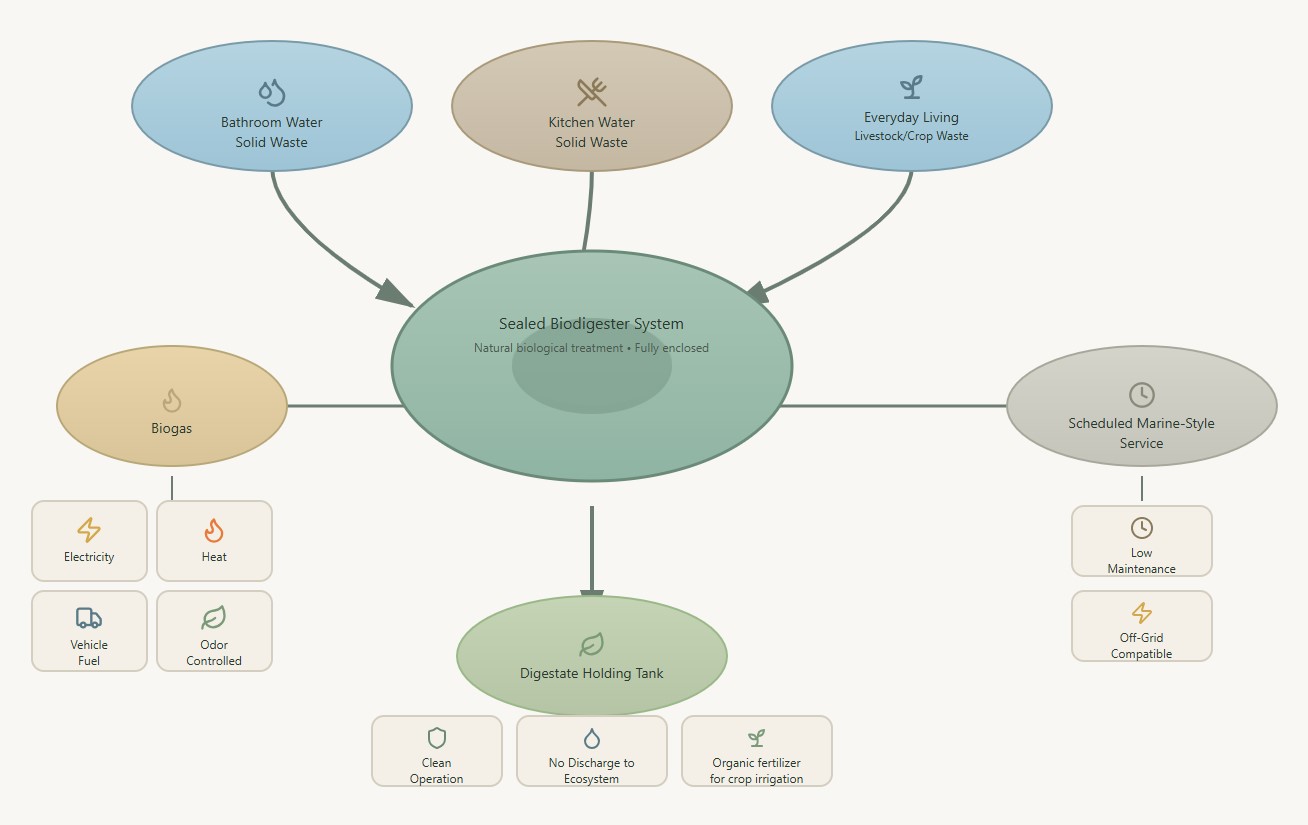 Ocean Pad utilizes a sealed anaerobic biodigester system designed to safely process blackwater and greywater onboard. Unlike traditional septic systems, the biodigester operates without leach fields, soil absorption, or discharge into surrounding waters.